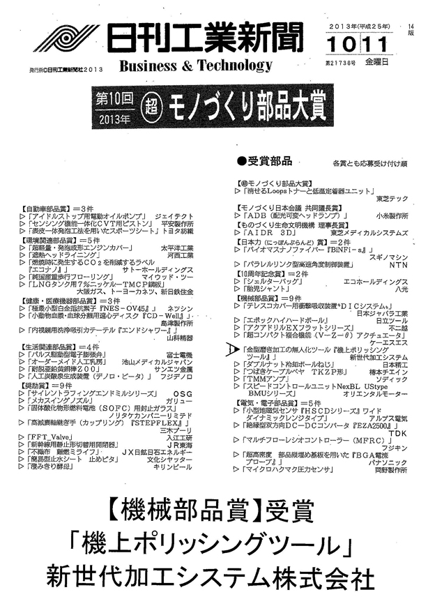 日刊工業新聞に『超モノづくり部品大賞』の受賞が発表され、弊社の機上ポリッシングツールが、機械部品賞を受賞いたしました。 2013年10月11日 最終更新日時 : 2024年11月14日 機上ポリッシングツール & ELID研削